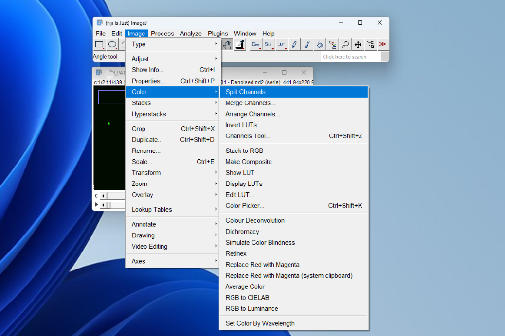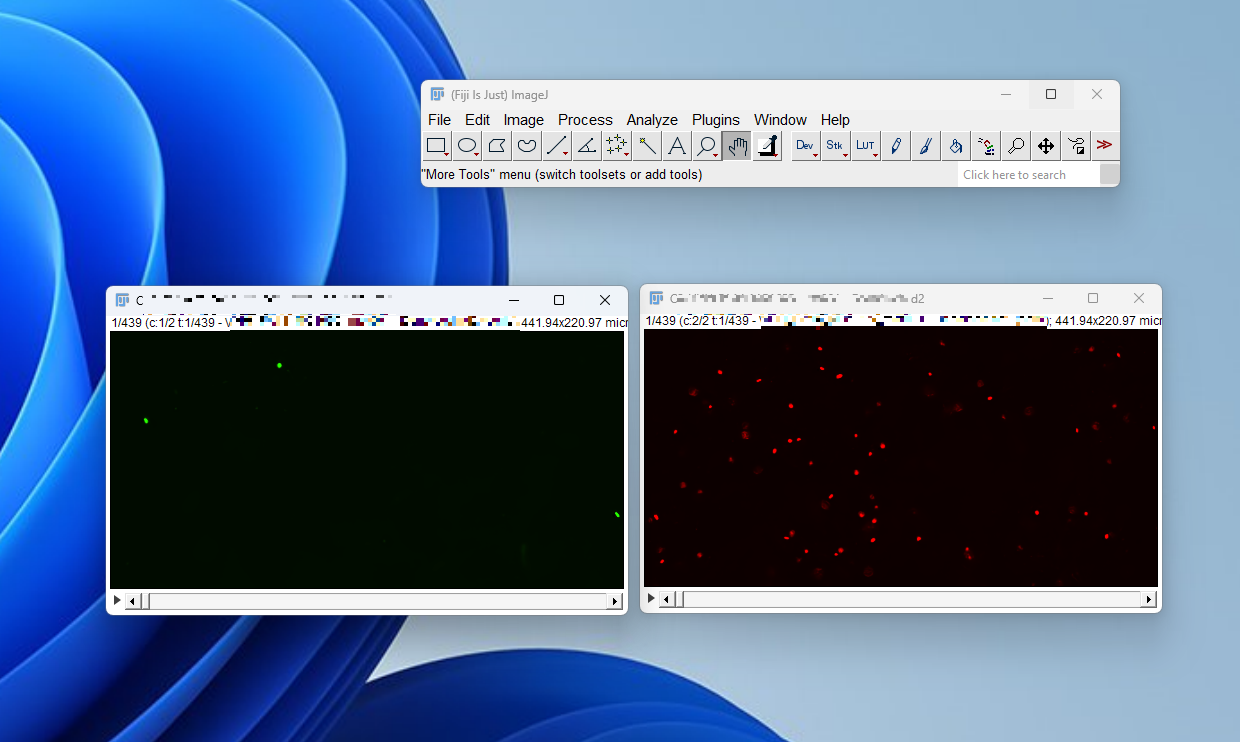 상단 Image 탭에서 Color - Spit channels를 클릭하면 약간의 처리 시간이 걸린 후,아래 사진처럼 각각의 채널로 분리하여 이미지 창을 만들어준다. 예시 이미지는 eGFP, RFP를 포함한 이미지로 Split channel기능을 통해 두 개의 채널로 분리되었다.