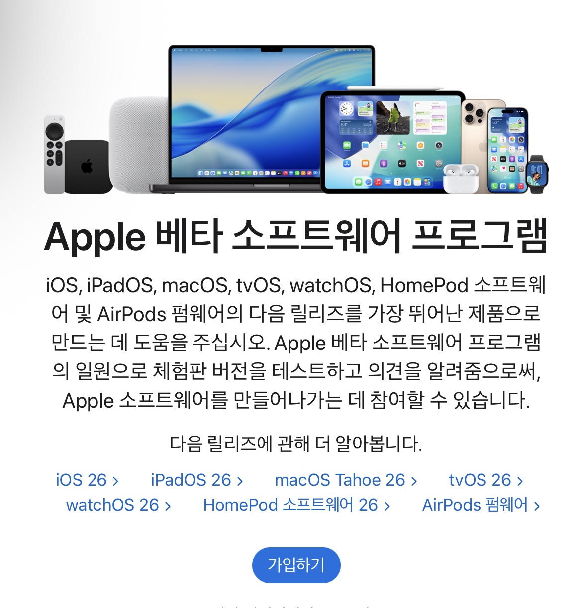 가장 먼저 해야 할 일은 공식 애플 베타 프로그램 페이지에 접속하는 것입니다. 주소는 다음과 같습니다. https://beta.apple.com/ko
