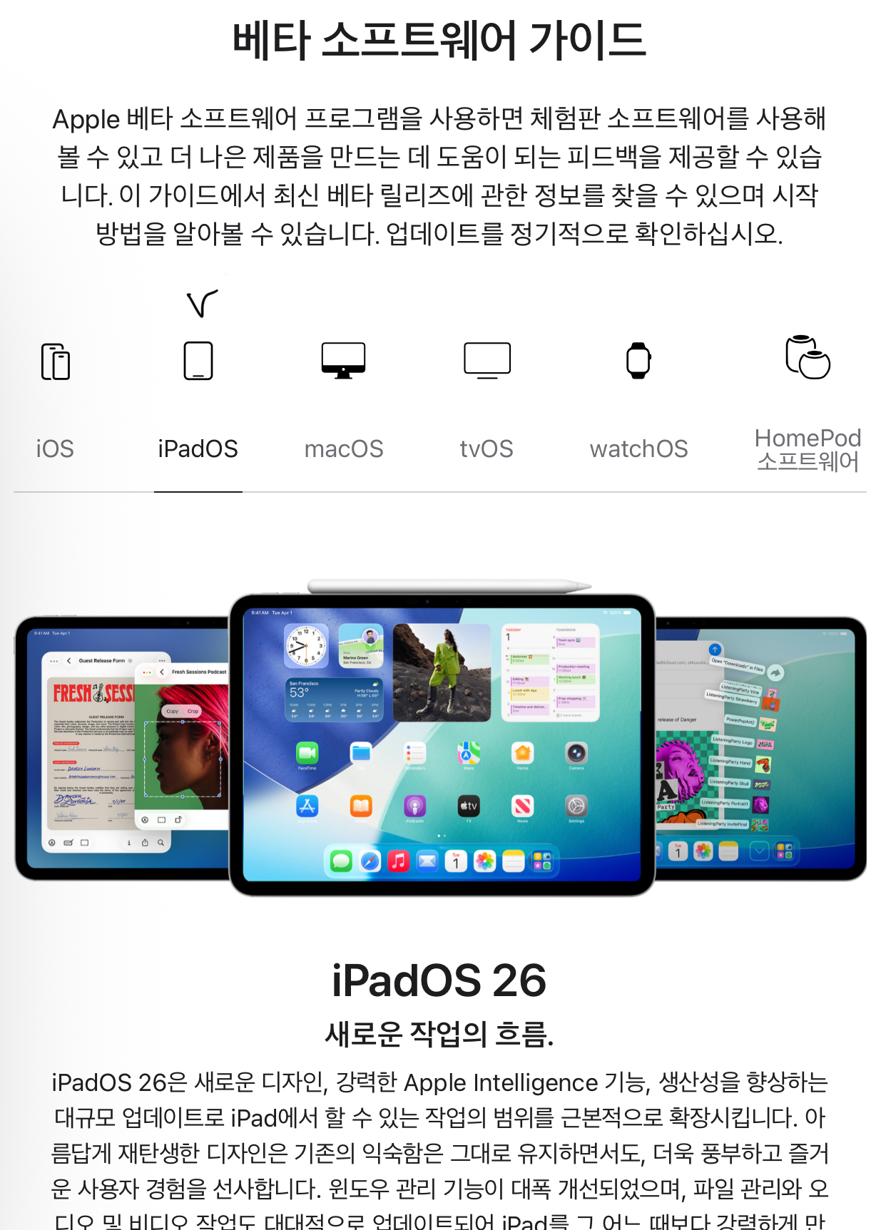 애플에서 iPadOS 26 퍼블릭 베타 버전을 공개했습니다.  정식 출시는 아직이지만, 퍼블릭 베타에 참여하면 누구나 새 기능을 미리 체험할 수 있는데요. 아이패드 유저라면 어렵지 않게 베타 소프트웨어를 설치할 수 있습니다. 이 글에서는 애플 공식 사이트를 통한 베타 등록부터 업데이트 설치까지의 전 과정을 한눈에 정리해 드리겠습니다.