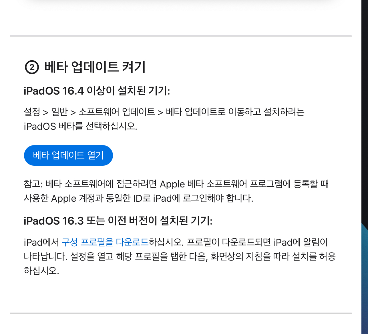로그인 후 화면 상단에 있는 ‘iPadOS’ 탭을 선택합니다. 그 아래 ‘베타 업데이트 열기’ 버튼을 클릭하면 아이패드의 설정 앱으로 자동으로 넘어갑니다.