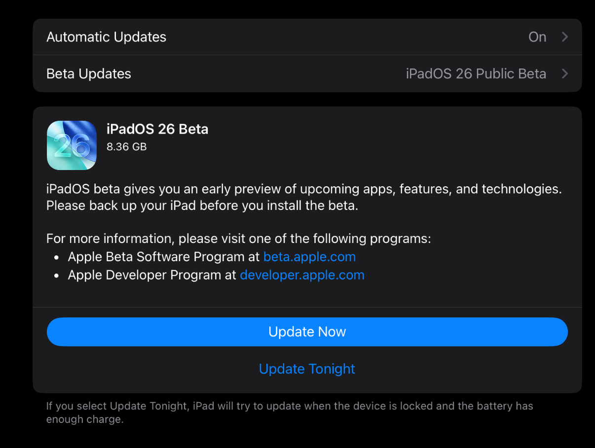 설정 앱이 열리면 ‘iPadOS 26 Public Beta'를 선택하고 설정 - 일반 - 소프트웨어 업데이트 이동하면 iPadOS 26 Beta를 업데이트할 수 있게 됩니다. 업데이트하기를 클릭하면 다운로드가 시작되고, 다운로드가 완료되면 지금 설치 또는 밤에 설치를 선택하여 새로운 OS을 업데이트할 수 있습니다.
